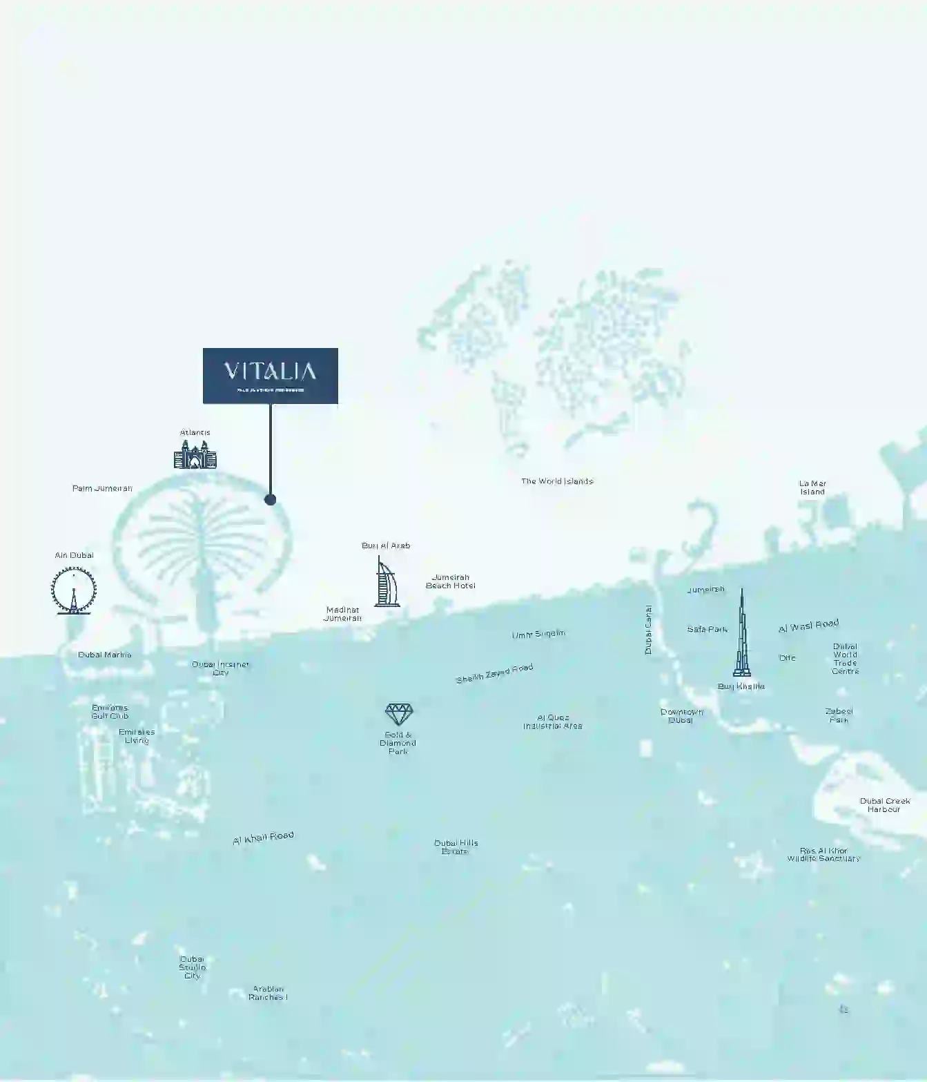 پالم جمیرا – Palm Jumeirah، جزیره مصنوعی نمادین دبی، بهعنوان یکی از برترین مناطق مسکونی و تفریحی شناخته میشود. ویتالیا رزیدنس – Vitalia Residence در هلال شرقی این جزیره واقع شده و دسترسی آسان و سریع به جاده شیخ زاید (E11) دارد که ارتباط سریع با مراکز اصلی شهر را فراهم میکند. نزدیکی به مکانهایی مانند هتل ریزورت آنانتارا پالم دبی (۵ دقیقه)، پارک آبی آکوادونچر (۱۵ دقیقه)، مرکز خرید نخیل (۱۲ دقیقه)، دبی مارینا (۲۰ دقیقه) و مدینه جمیرا (۲۲ دقیقه) از دیگر مزایای این موقعیت مکانی است. این ویژگیها، ویتالیا رزیدنس – Vitalia Residence را به مکانی ایدهآل برای زندگی لوکس با دسترسی آسان تبدیل کرده است.